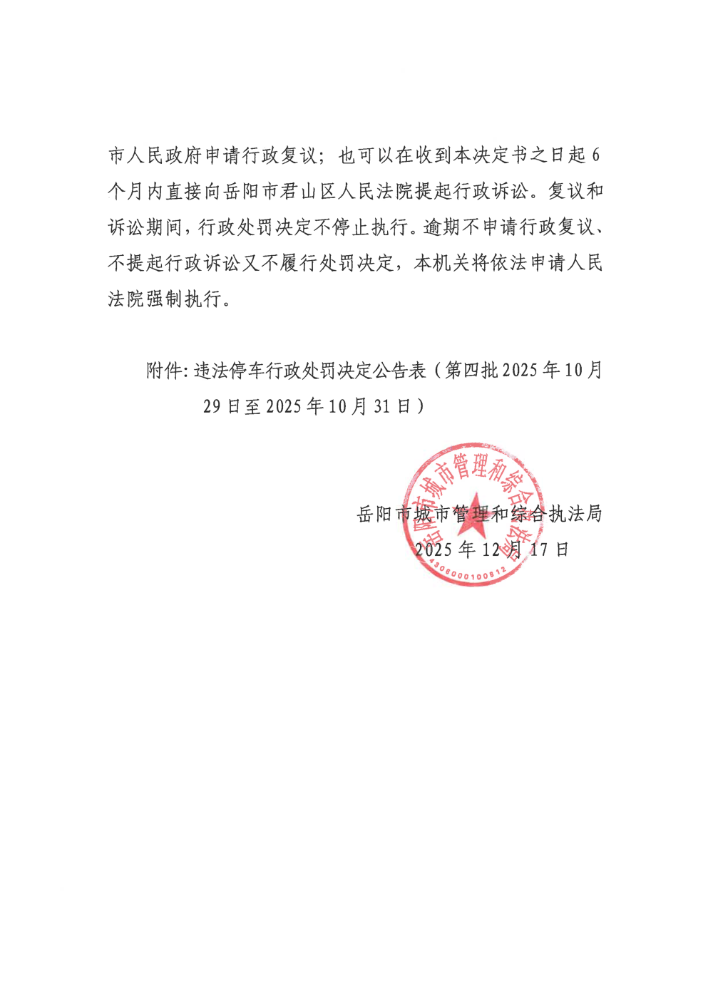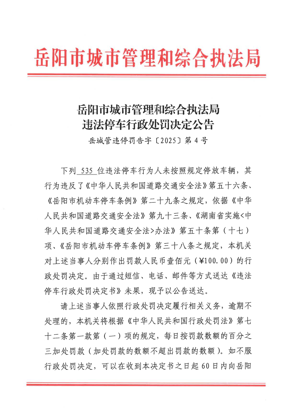岳阳市城市管理和综合执法局违法停车行政处罚决定公告(岳城管违停罚告字[2025]第4号)